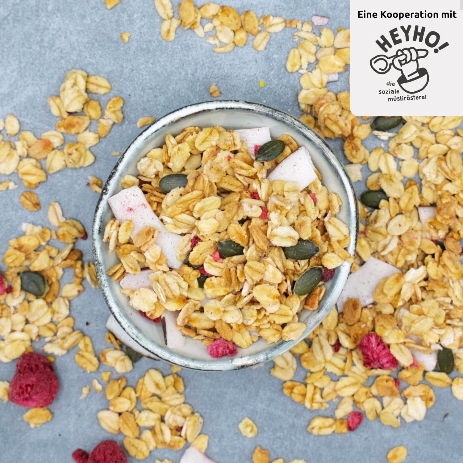 Man sagt ja es gebe unter den Menschen Eulen und Lerchen, also Langschläfer:innen und Frühaufsteher:innen. Mit diesem Granola werden auch Eulen zu Lerchen, die vorfreudig aus dem Bett hüpfen ! Dafür sorgen handgeschlagene, knusprige Kokosspalten und eine extra Portion Himbeeren. Das Hafer-Granola ist vegan, in Kokosöl geröstet und macht Dich mit seiner Knusprigkeit direkt munter. Das ist aber noch nicht alles, denn dieses Müsli ist auch noch sozial. Es kommt direkt auf der sozialen HEYHO Müslimanufaktur. Schmeckt gut und tut Gutes!